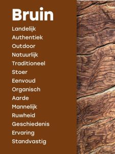 Bruin is de kleur van de aarde, van gronden en van organisch. Daardoor associëren wij begrippen als ruwheid, landelijk en onbewerkt met de kleur bruin. Deze ruwheid zorgt ervoor dat bruin een mannelijke en stoere uitstraling heeft. Ook is bruin een goede keuze voor merken die voor standvastigheid, traditie en ervaring staan, bruin roept immers het gevoel van geschiedenis op. Deze symbolische betekenis zorgt dat bruin vaak wordt ingezet wanneer we het ‘back to the roots’ gevoel willen meegeven aan de consument. Waar geel wordt geassocieerd met de lente is bruin een kleur die typerend is voor de herfst, een kleur die past bij het gevoel van samen voor de houten kachel zitten. De kleur bruin brengt een warme, authentieke, verfijnde en ambachtelijke sfeer met zich mee.