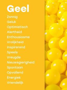 Wanneer je het gevoel van speelsheid en vrolijkheid wilt overbrengen met jouw merk, dan kies je voor de kleur geel. Geel bevat het meeste licht van alle kleuren en wordt geassocieerd met de zon en lentebloemen. Niet zo gek dus dat we spontaan optimistisch worden als we deze kleur op straat tegenkomen. Deze kleur wordt ook wel de kleur van geluk genoemd en straalt energie uit. Precies om die reden gebruiken merken deze kleur wanneer zij spontaniteit willen uitdrukken.