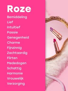 Roze is een delicate kleur en kan worden omschreven als het ‘lieve’ zusje van rood. Beide kleuren staan voor liefde en passie maar waar de kleur rood staat voor het agressieve in deze twee, staat de kleur roze juist voor de zachte kant van liefde. Denk aan romantiek, onschuldig flirten en charme. Roze wordt om die reden ook vaak ingezet als de kleur van universele liefde, zowel ‘self-love’ als liefde voor anderen. Wanneer je meer de nadruk wilt leggen op de onschuldige kant van je merk kun je beter voor een licht roze kleur kiezen en wanneer je juist meer kracht of passie wilt toevoegen ga je voor een donkerdere variant.
