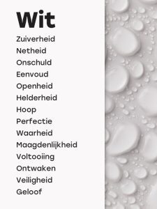 Last but not least! De laatste kleur op onze lijst is wit. We weten dat wit, net zoals zwart, niet als officiële kleur kan worden bestempeld. Toch heeft deze niet-kleur wel degelijk effect op ons gedrag en onze emoties. Dat maakt het de moeite waard om wit mee te nemen in deze lijst. Wit wordt geassocieerd met onschuld, waarheid, reinheid of maagdelijkheid. Om die reden dragen artsen en verpleegkunde witte kleding en dragen bruiden een witte jurk als ze trouwen. Van oudsher wordt wit ook geassocieerd met religie, God en alles wat ‘heilig’ is. Dit is terug te zien in bijvoorbeeld eeuwenoude schilderijen waarbij heilige personen omringd worden door een wit licht.