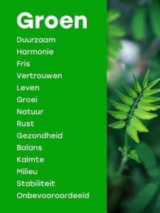 Groen is een kleur die geassocieerd wordt met flora. Daarom zien we dat deze kleur vaak wordt ingezet bij bedrijven als tuincentra, hoveniers, natuurgebieden en dierentuinen zoals Blijdorp. Groen past ook bij verzorgende beroepen waarbij een rustgevende omgeving belangrijk is. Denk hierbij aan ziekenhuizen, wellnesscentra en therapeuten.