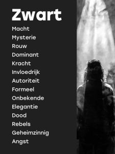 De kleur zwart verwijst naar het geheimzinnige, het onbekende. De kleur zwart wordt gebruikt om spanning en mysterie op te wekken. Vanuit de Westerse cultuur wordt de kleur zwart veelal geassocieerd met de dood. Dit komt omdat deze kleur bijna altijd bij begrafenissen gedragen wordt en het symbool voor de dood ‘Magere Hein’ in een zwart gewaad gehuld is. Hoewel zwart vaak wordt geassocieerd met begrippen als rouw, angst en verdriet, staat deze kleur ook voor kracht en autoriteit. De reden waarom scheidsrechters in veel sporten zwart dragen, is omdat zwart als formele, elegante en prestigieuze kleur wordt gezien. Daarom wordt er aangeraden zwart te dragen naar sollicitaties. Met zwart maak je een krachtige indruk vanaf het eerste moment, maar pas op, het blijft een moeilijke kleur om te verwerken in je merk of huisstijl door alle negatieve associaties.