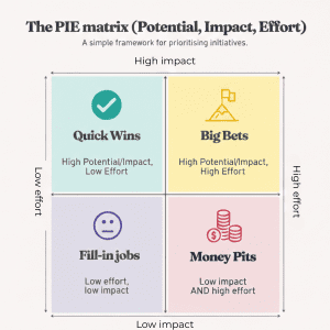 De PIE-matrix helpt je te focussen op campagnes die een hoog potentieel hebben, de grootste impact kunnen maken, en relatief eenvoudig te implementeren zijn. Dit zorgt ervoor dat je je energie en middelen optimaal inzet voor de campagnes die de grootste winst opleveren.