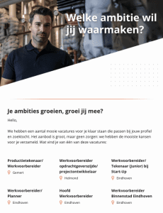 Personalisatie gaat verder dan alleen inhoud. Daarom benaderen we de doelgroep met een informelere, minder invasieve toon om het ‘Big Brother’-gevoel te vermijden. Door dynamische en persoonlijke content voelde de e-mail meer aan als een nieuwsbrief dan als een commercieel bericht. Dit verhoogde de acceptatie en zorgde ervoor dat ontvangers een gepersonaliseerde vacaturemail kregen op het moment dat hun interesse het grootst was.