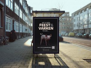 In de intensieve varkenshouderij is er al jaren veel dierenleed. Een schokkend feit is dat bij 99% van alle biggen de krulstaart onverdoofd wordt afgebrand, een pijnlijke ingreep die al jaren verboden is, maar nog steeds op grote schaal wordt toegepast. Om dit leed onder de aandacht te brengen ontwikkelden we met Varkens in Nood de bewustwordingscampagne “Het is geen feest om een varken te zijn…”.